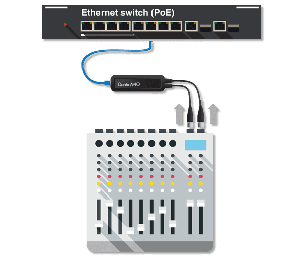 Jeder Dante AVIO Analog-Adapter ist ein vollwertiges, leistungsstarkes Dante-Gerät und gewährleistet die Automatisierung und Benutzerfreundlichkeit, die Dante zur weltweit führenden Audio-Netzwerklösung gemacht haben. Die Adapter werden automatisch erkannt und sind sofort einsatzbereit, sobald sie angeschlossen sind. Zusätzliche Netzteile sind nicht erforderlich – ein üblicher PoE (Power over Ethernet) Switch genügt, um die Adapter betriebsbereit zu machen.